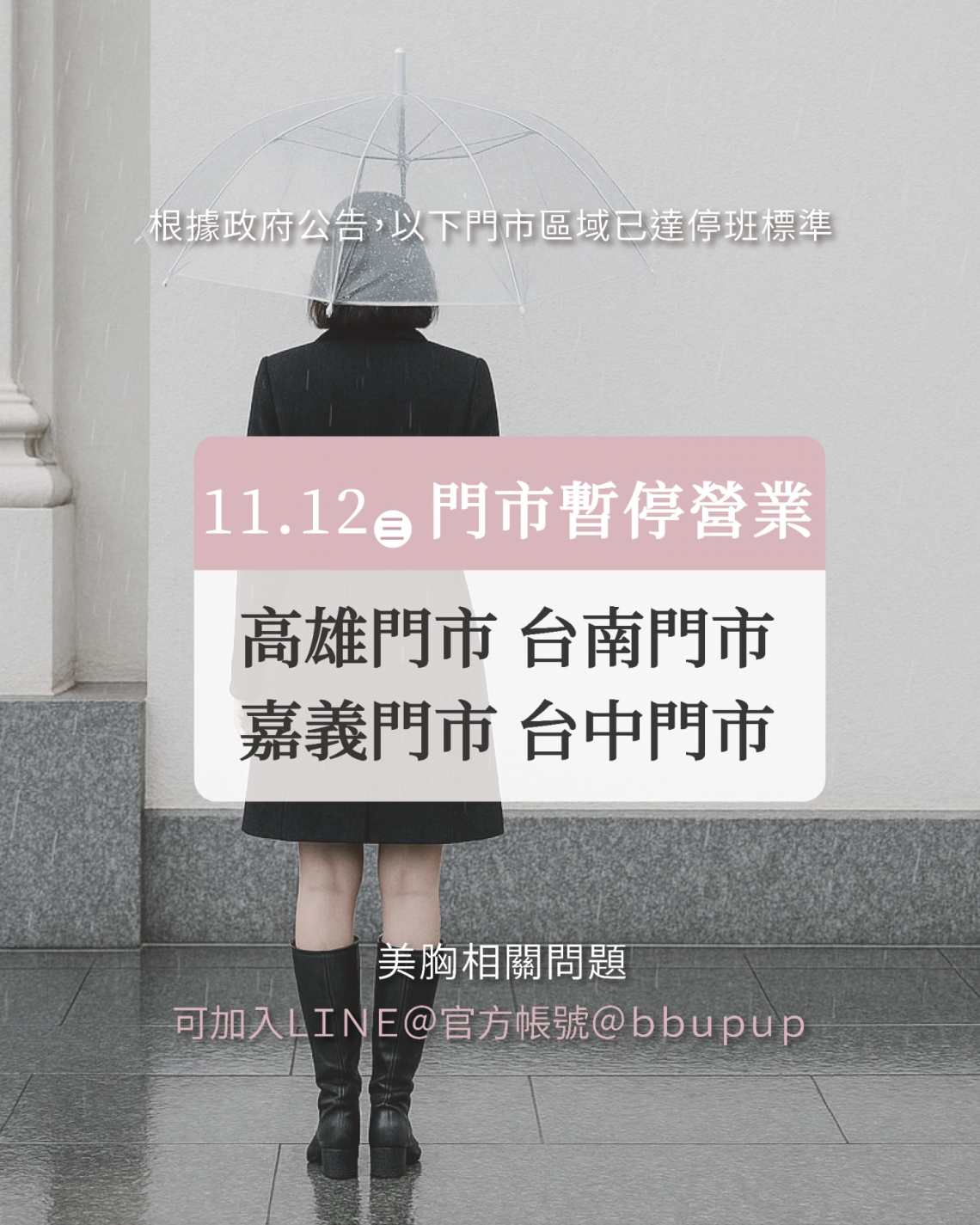 高雄門市、台南門市、嘉義門市、台中門市將於 11/12(三)暫停營業一天。