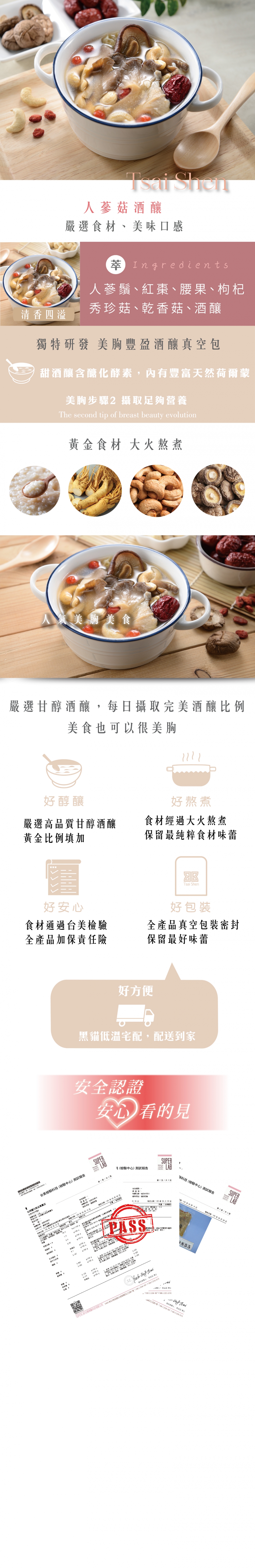甜酒釀含有醣化酵素,為天然的荷爾蒙,可促進美胸所需促進身體機能,另含有人蔘鬚、紅棗、腰果、枸杞、秀珍菇、乾香菇,美胸營養再升級.
